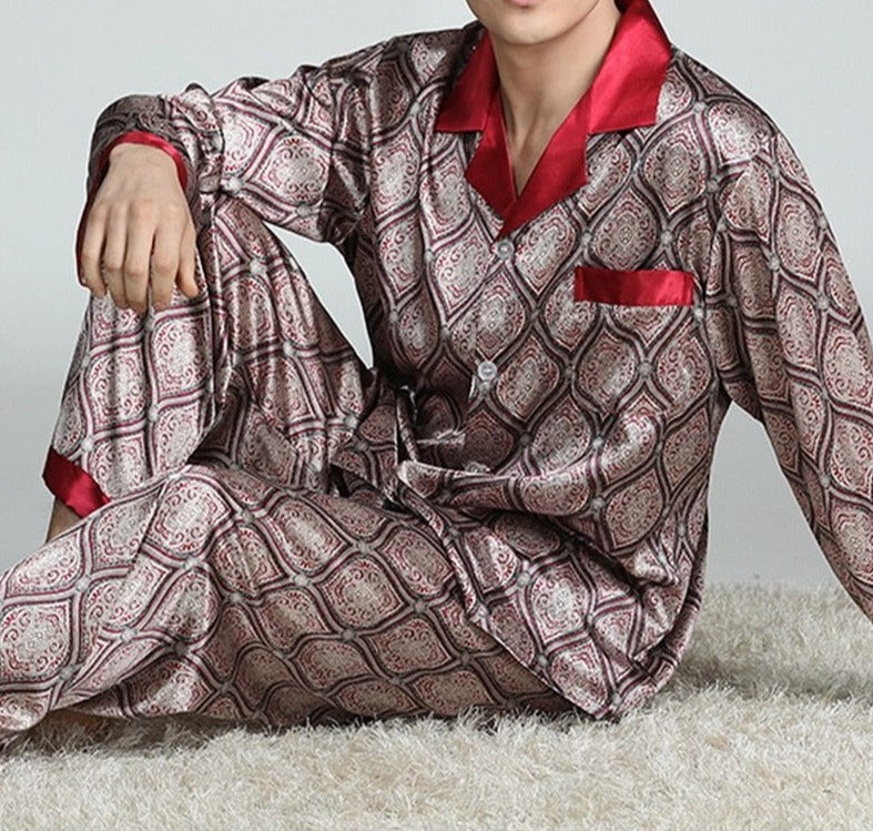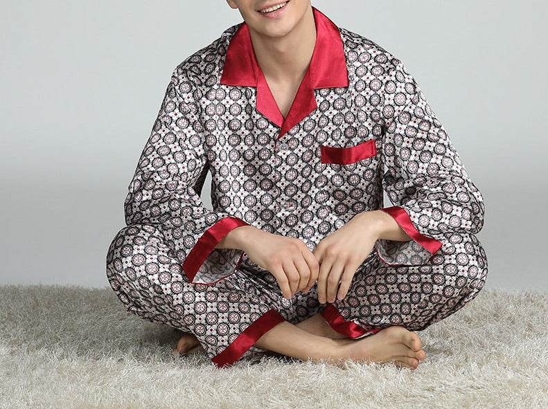 Men’s Printed Silk Pajamas Spring And Summer Long-Sleeved Suit